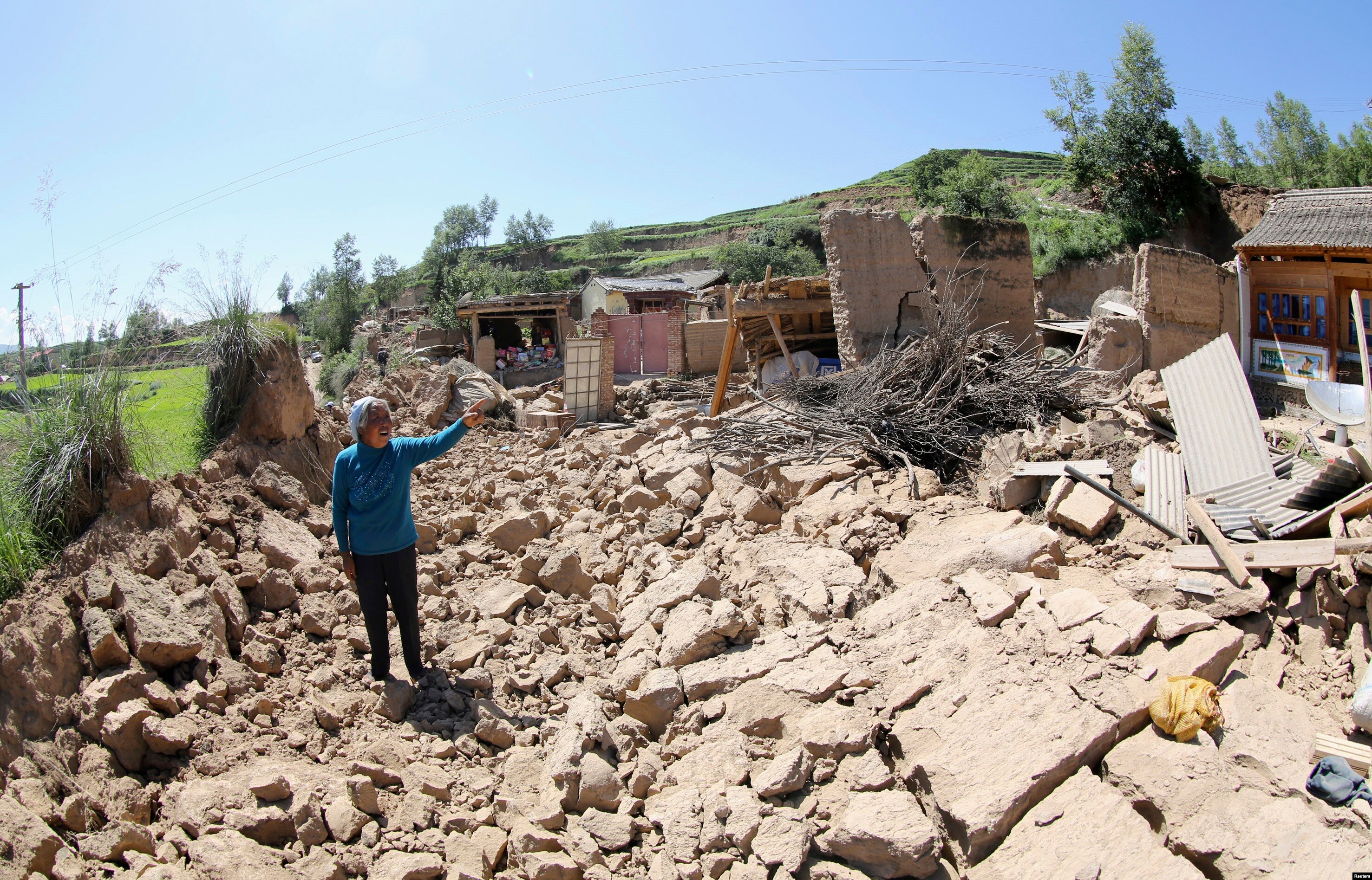 A woman points at her collapsed home after a 6.6 magnitude earthquake hit Minxian county, Dingxi, Gansu province, July 22, 2013.