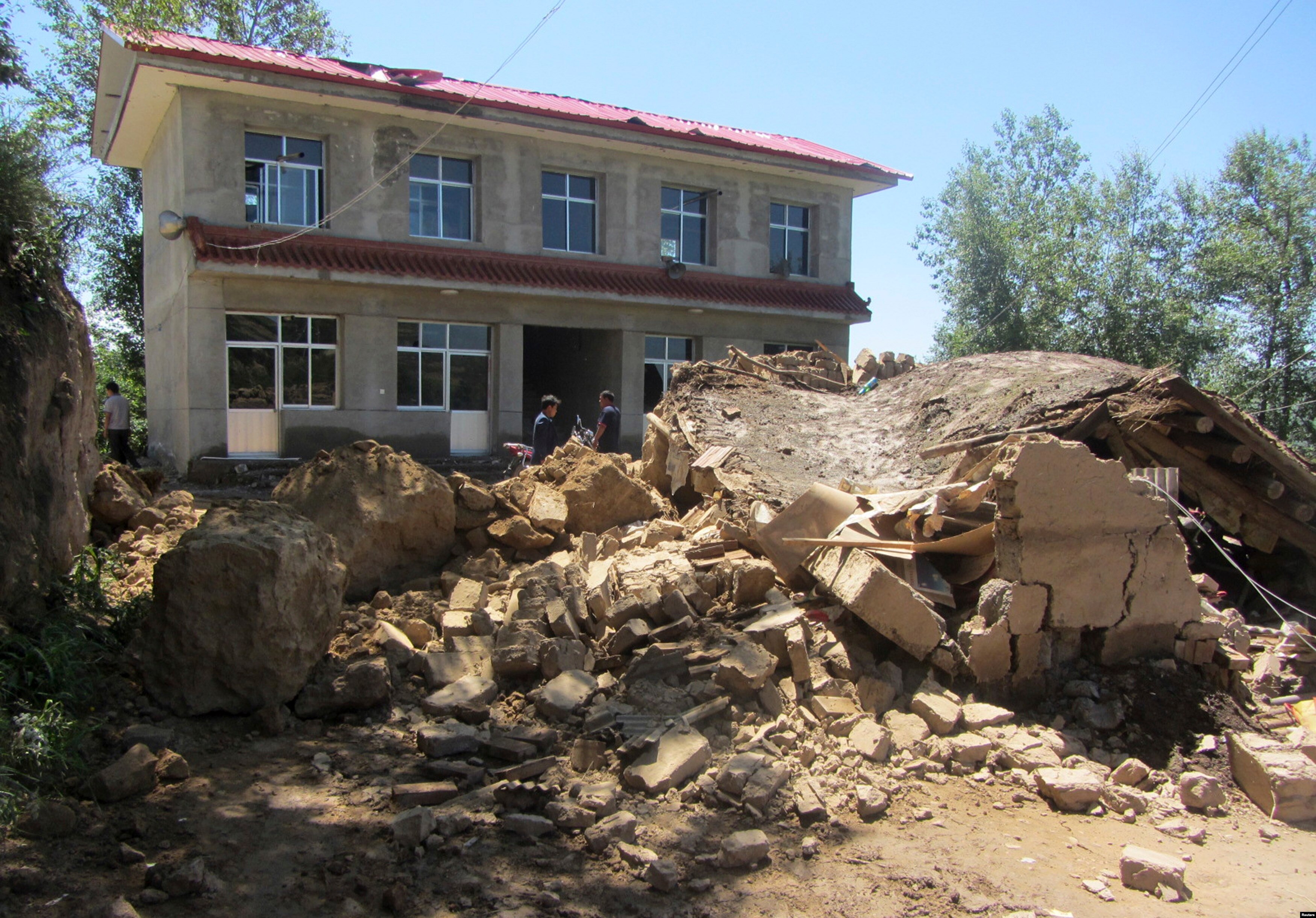 People stand next to a collapsed house after an earthquake struck Minxian county of Dingxi, Gansu province, China, July 22, 2013.