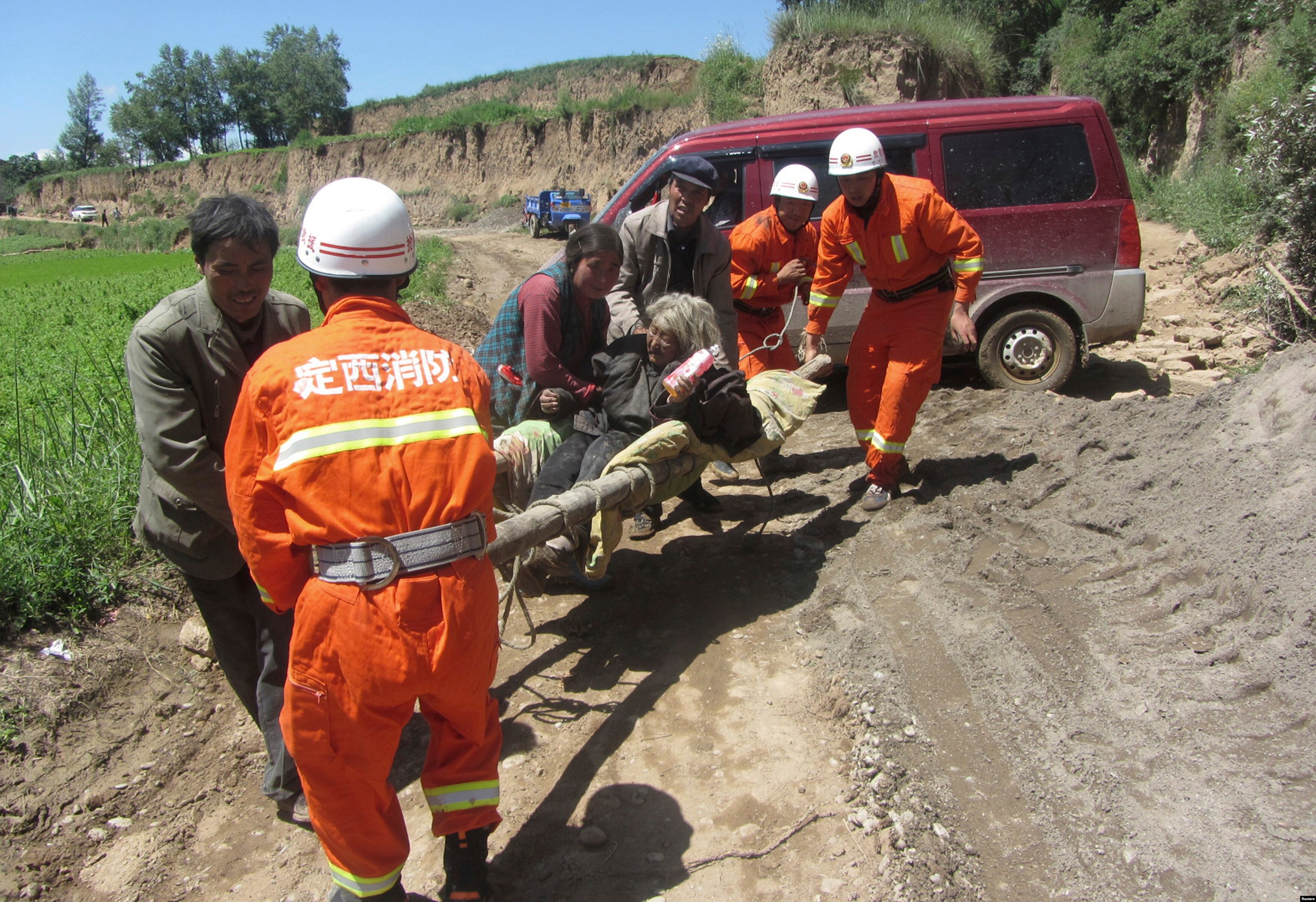 Firefighters on the scene in Minxian county, Dingxi, Gansu province, China, July 22, 2013.